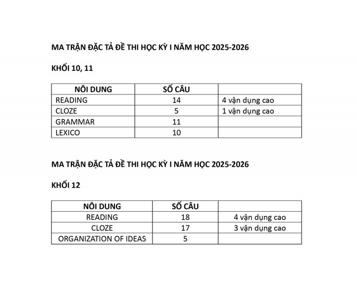 Ma trận đặc tả bài Kiểm tra cuối Học kì I năm học 2025-2026 - Môn Tiếng Anh