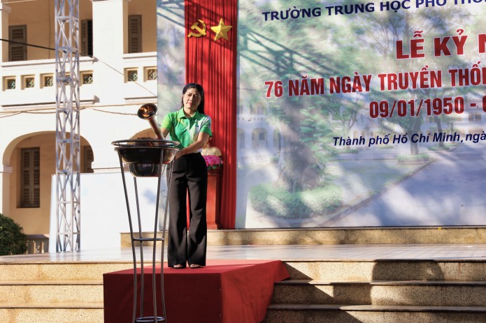 Cô Nguyễn Thị Ái Vân - Tổ trưởng Tổ Ngữ văn ôn lại truyền thống anh hùng, yêu nước của HS-SV Thành phố và HS Petrus Ký - Lê Hồng Phong.