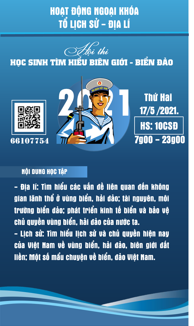 Ngày 17 tháng 05 năm 2021 Tổ Lịch sử - Địa lí tổ chức thành công ngoại khóa với chủ đề "Học sinh tìm hiểu biên giới - biển đảo" theo hình thức online. Dưới đây là một số hình ảnh của buổi ngoại khóa: