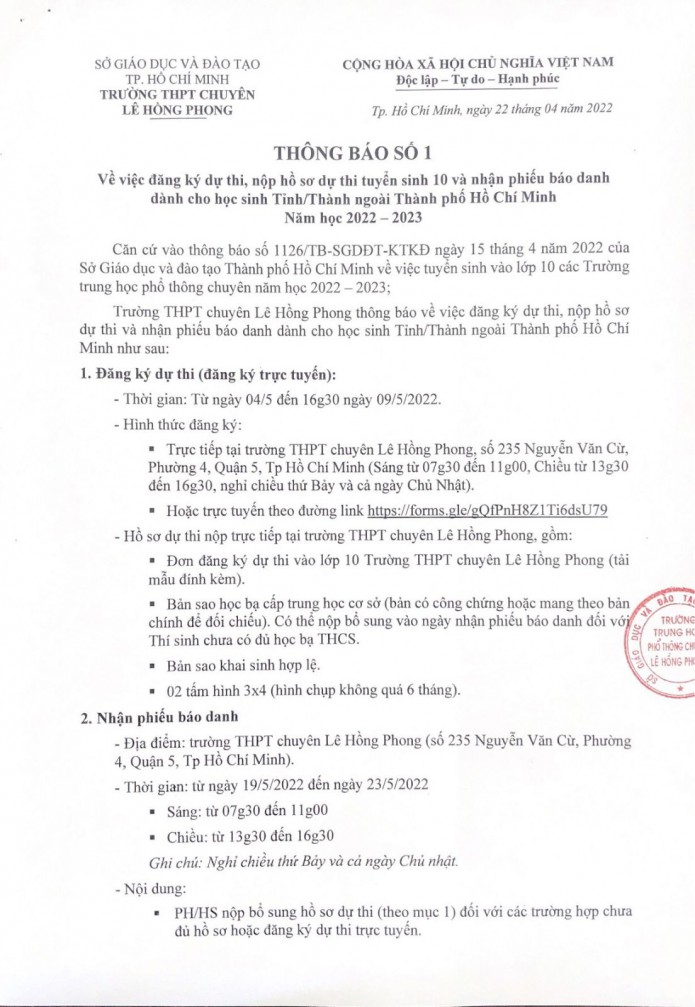 Thông báo số 1 - Về việc đăng ký dự thi, nộp hồ sơ dự thi tuyển sinh 10 và nhận phiếu báo danh dành cho học sinh Tỉnh/Thành ngoài Thành phố Hồ Chí Minh Năm học 2022 – 2023