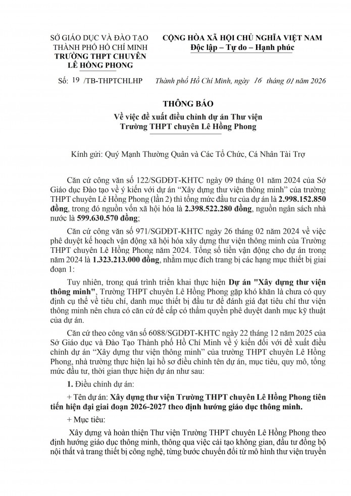 Thông báo Về việc đề xuất điều chỉnh dự án Thư viện Trường THPT chuyên Lê Hồng Phong